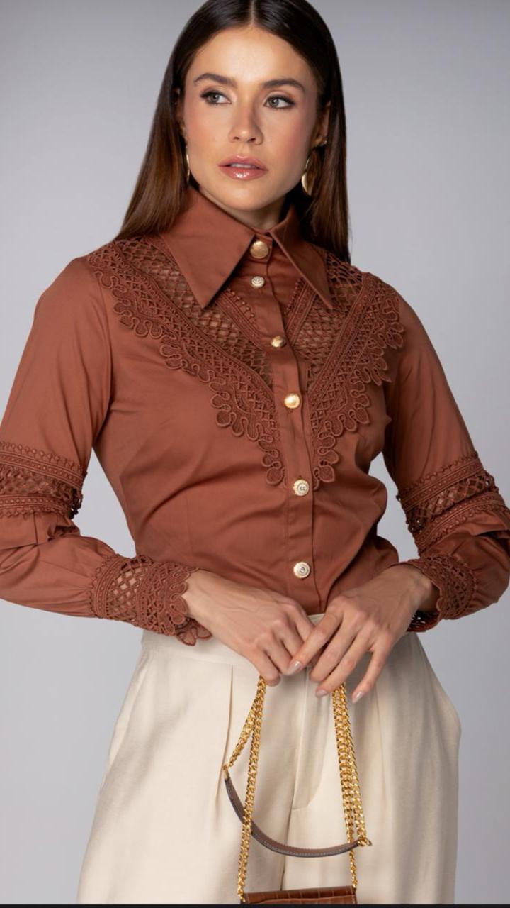 Camisa de renda com detalhes sofisticados para valorizar o visual em ocasiões especiais.