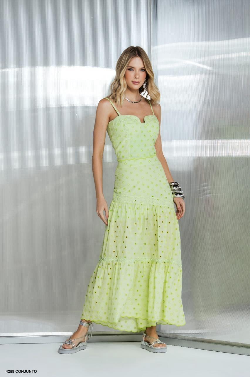 Conjunto bordado em tom verde claro, perfeito para ocasiões que pedem atenção ao detalhe. O conjunto vem com saia longa e cropped com alças finas, garantindo caimento confortável e charmoso. Peças forradas.