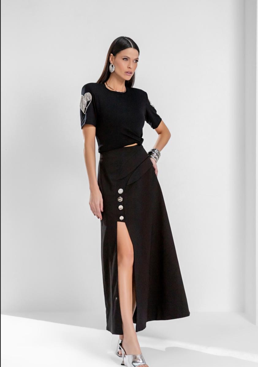 Saia midi elegante que combina estilo com conforto para a mulher moderna. Confeccionada em tecido leve com bom caimento, o comprimento midi valoriza diferentes tipos físicos. Os botões na lateral são metálicos, dando um charme especial à peça.