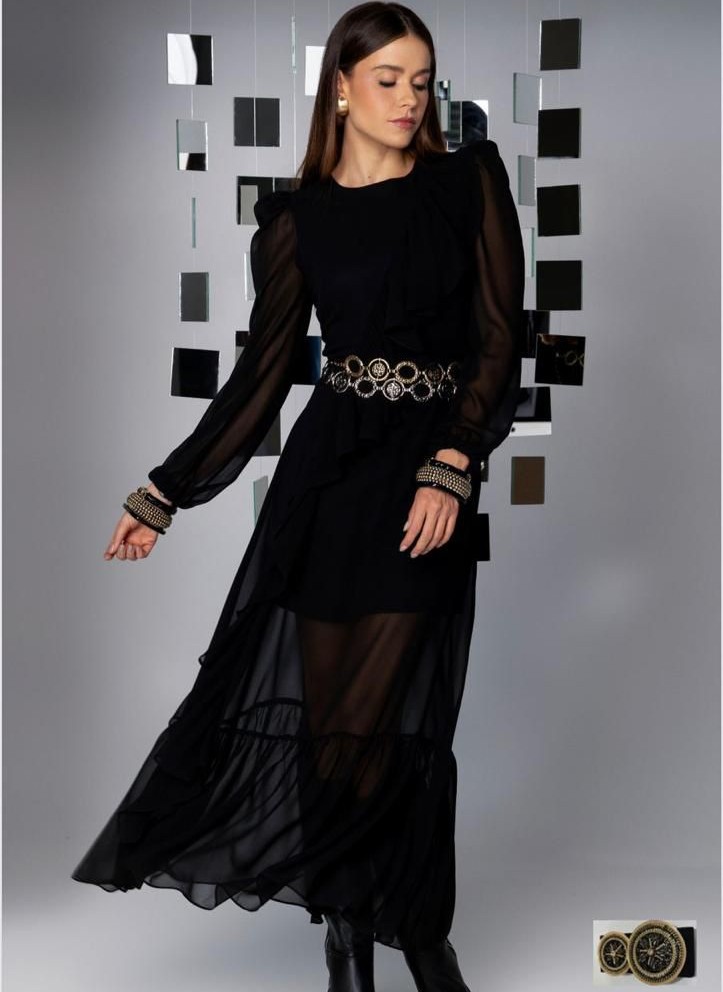 Vestido com design elegante e cinto para marcar a cintura, ideal para ocasiões especiais e looks sofisticados. Confeccionado em tecido tule com transparência controlada, possui forro até a altura do joelho e mangas longas. O cinto acompanha o vestido com design exclusivo.